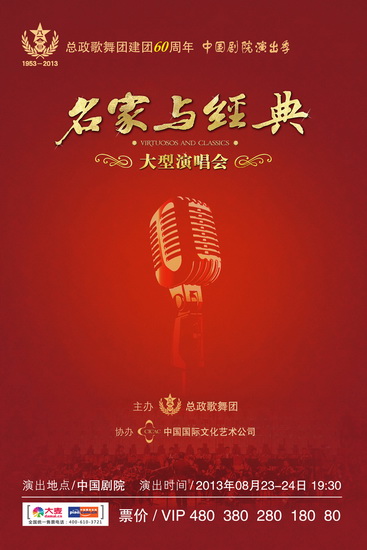 大型演唱會《名家與經典》以全明星陣容在中國劇院上演,以內部紀念專場的形式正式拉開總政歌舞團60周年“中國劇院演出季”的帷幕。8月23日、24日,總政歌舞團的歌唱家們還將連續兩天為普通觀眾獻上該經典演出。
