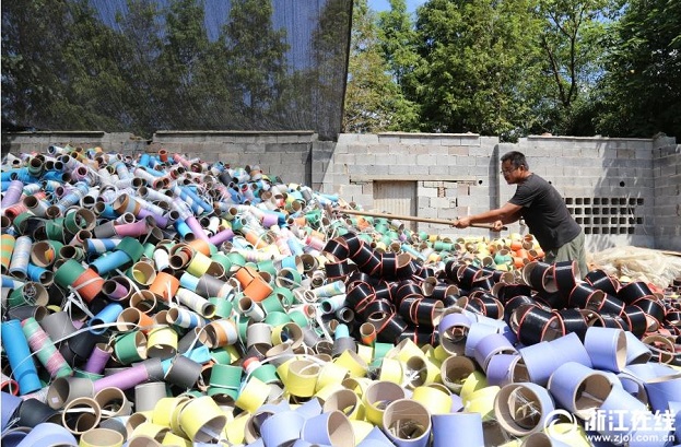 8月28日,湖州市吳興區埭溪鎮小羊山村,村民陳堤飛夫妻倆正在對回收的化纖管進行分揀處理、壓縮打包和裝車出售。據介紹,陳堤飛4年前開始從事化纖管等廢品回收,每年回收各類廢品1200多噸,收入在10萬元以上。 (浙江在線拍友 鄧德華 攝)