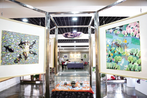 日前,嘉善縣姚莊鎮洪福路洪福印象館的農民畫舍令人耳目一新。據了解,洪福印象館由農民畫舍和大往展廳兩部分組成,陳列了老照片和大往圩農耕文化的系列展品,并展示了利用農民畫開發出的雨傘、鞋子、鼠標、扇子等科創產品近200件。( 攝影 胡凌翔)