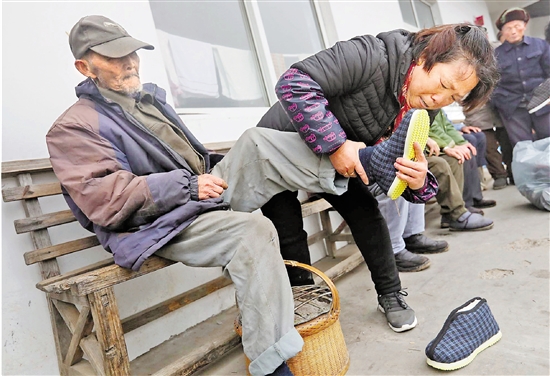 近日,常山縣大橋頭鄉客弄村傅珍芳(右)為衢江上方鎮和灰坪鄉的敬老院送去70雙棉鞋。現年60歲的她從2009年開始免費為衢州幾十家敬老院和附近村莊老人縫制過冬棉鞋,共送出6000多雙棉鞋,被大家親切地稱為“棉鞋阿姨”。