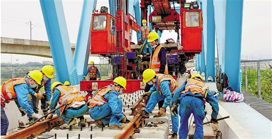 4月18日,全長8.355公里的金臺鐵路重點(diǎn)控制性工程金華市永康江特大橋貫通。金臺鐵路復(fù)工建設(shè)以來,承建全線梁架和鋪軌施工的中鐵一局集團(tuán),在確保“零疫情”和安全質(zhì)量的前提下,按下項目建設(shè)“加速鍵”,力爭奪回疫情造成的停工損失,確保鐵路按期建成通車。圖為金臺鐵路永康江特大橋建設(shè)現(xiàn)場,工人們正在緊張施工。